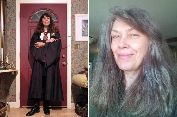 If you will refer to the photo above, you will see me, on the left, dressed as Hermione Granger, ready to go to work as an outpatient PT, on Halloween Day, seventeen years ago. On the right, you will see me a week ago. You may note that my hair looks pretty much the same in both photos, except for the color. In the left-hand photo, I’d started having it dyed to hide the incipient gray. And in the right-hand photo, it’s obvious that I stopped having it colored about three years ago. Aside from that though, I’m wearing the same expression on my face. And I know I had the same attitude.
